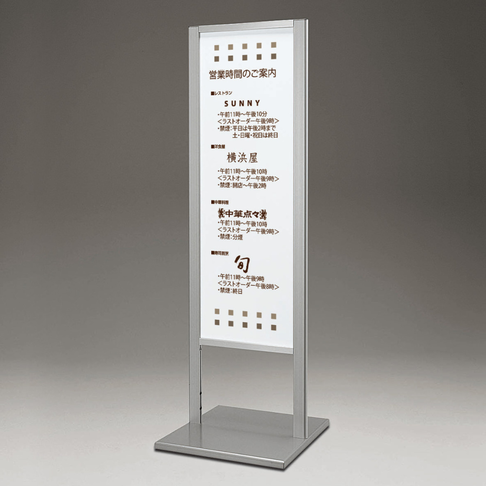 - 特に施設のエントランス付近での告知など公共空間をフォーマルに演出する落ち着いたデザイン。