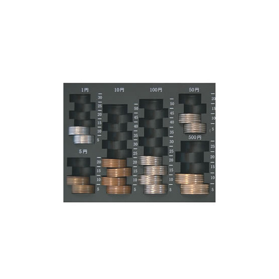 - 硬貨収納部:各5枚仕切(1円:30枚、5円:20枚、10円:50枚、50円:20枚、100円:50枚、500円:25枚)