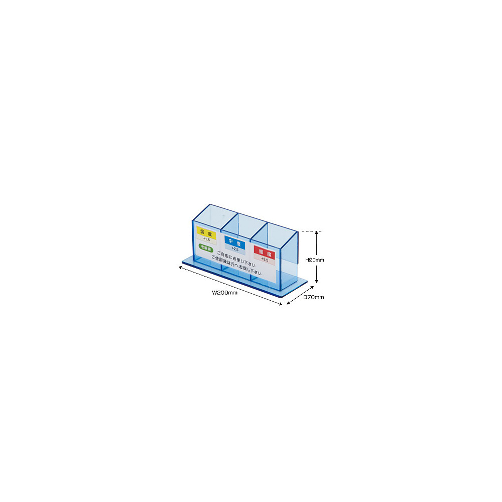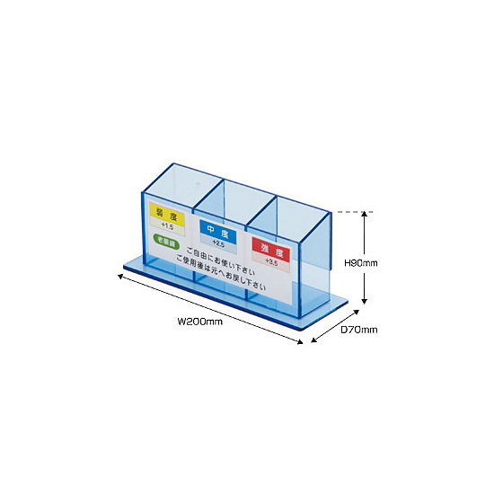 - ディスプレイケース、老眼鏡 弱度+1.5 イエロー、老眼鏡 中度+2.5 ブルー、老眼鏡 強度+3.5 レッド×各1個