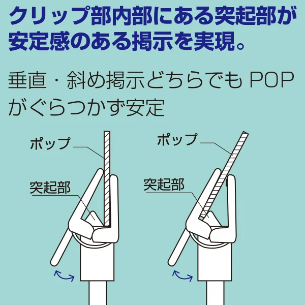 - 定番のクリップ式POPスタンドをより使いやすく改良、しかもローコストを実現!