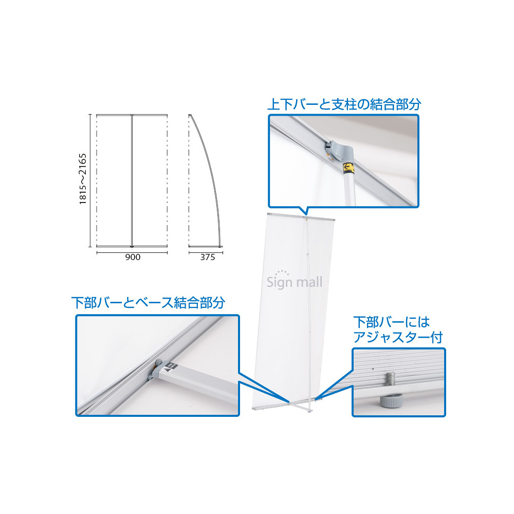- 1台のバナースタンドを弓形に湾曲したR型と湾曲のない平坦なストレート型にワンタッチで切り替えてご使用いただけます。