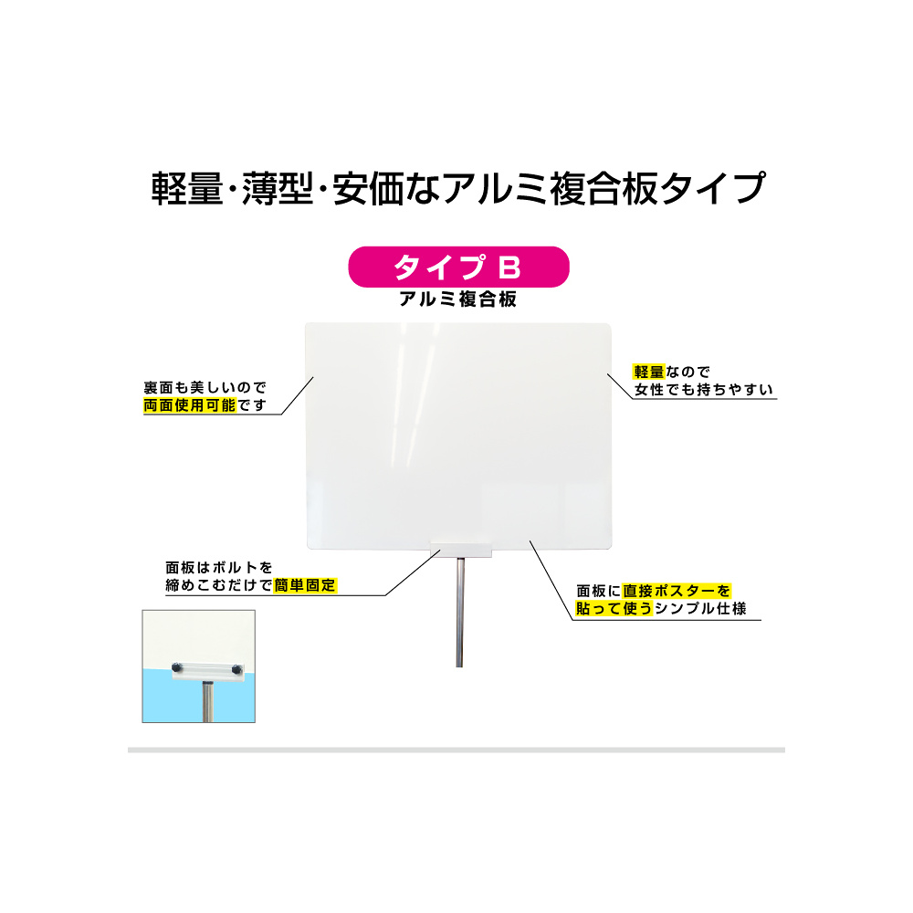 - 【白板タイプ】表示面に両面白無地のアルミ複合板が付属されています。ポスターを直接両面テープ等で貼ってご利用いただけます。