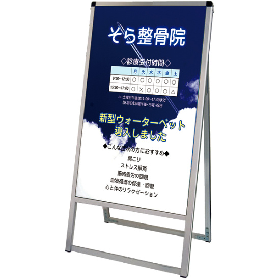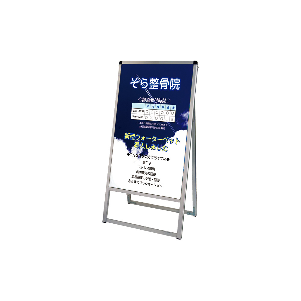 - フレーム幅が22mmと細くスッキリとして見栄えのスタンダードなA型看板。MADE IN JAPANの安心の日本製で耐久性も抜群。
