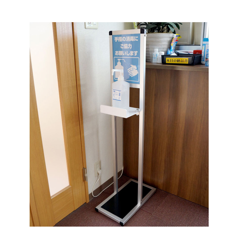 アルコール消毒推奨ポスター付のポンプスタンド。A4表示部分はご自由に差し替え可能です。