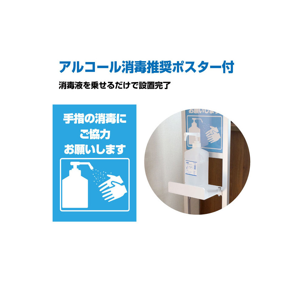 - お届け時に予めA4サイズのポスター「手指の消毒にご協力お願いします」をセットした状態で出荷致しますので、お手元に届きましたらアルコール消毒液ボトル(別売)をポンと置いて、すぐにお使い頂けます。