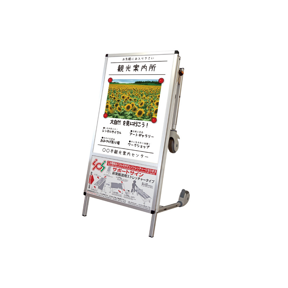 - 普段は、屋外用A型看板として駅やイベント会場 店舗前などの屋外看板として最適な看板が緊急時、ストレッチャーとして救護対象者を安全な場所まで搬送できます。背が低いショートタイプは、エレベーターも利用可能で小回りが効きます。