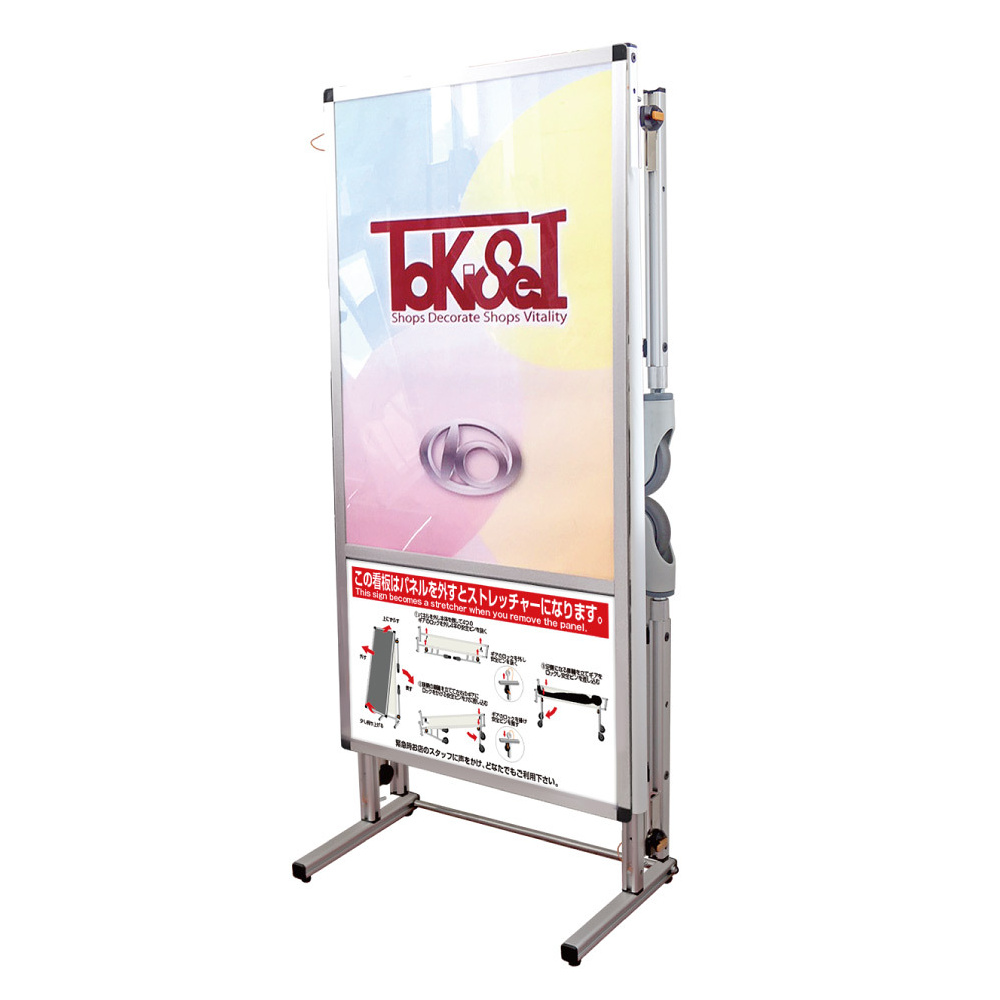 屋内直立看板がストレッチャーに早変わり!通常は案内看板・非常時はストレッチャーとして1台2役の機能性看板。
