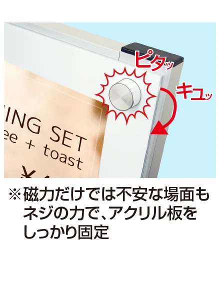 - ※磁力だけでは不安な場面もネジの力で、アクリル板を固定