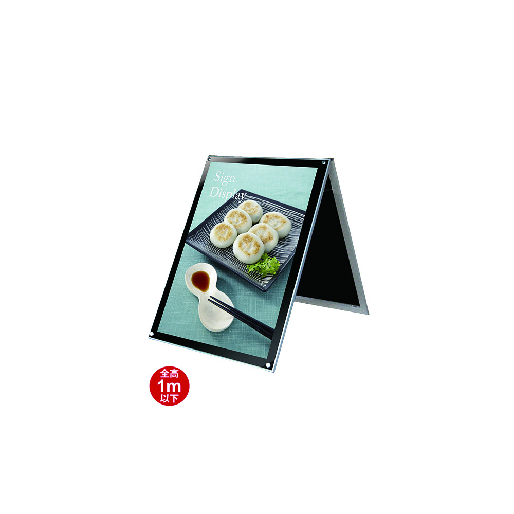 - カバーアクリルと背板のクリアランスは2mmなのでポスターを2枚セットできます。ランチメニューとディナーメニューの交換時は、上部二ヵ所のマグネジビスを取り外し、アクリルを少し手前に開きポスターを前後入れ替えるだけ