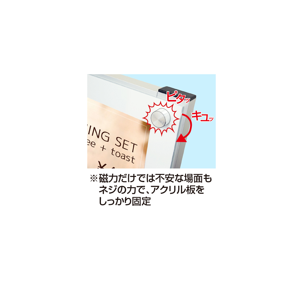 - ※磁力だけでは不安な場面もネジの力で、アクリル板を固定