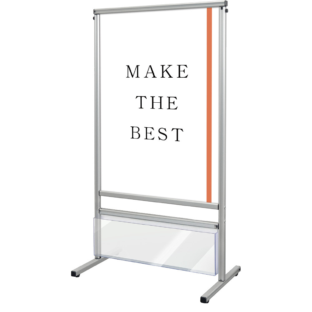 - 直立スタイルのポスター展示とA4カタログの配布を同時に行えるスタンド看板