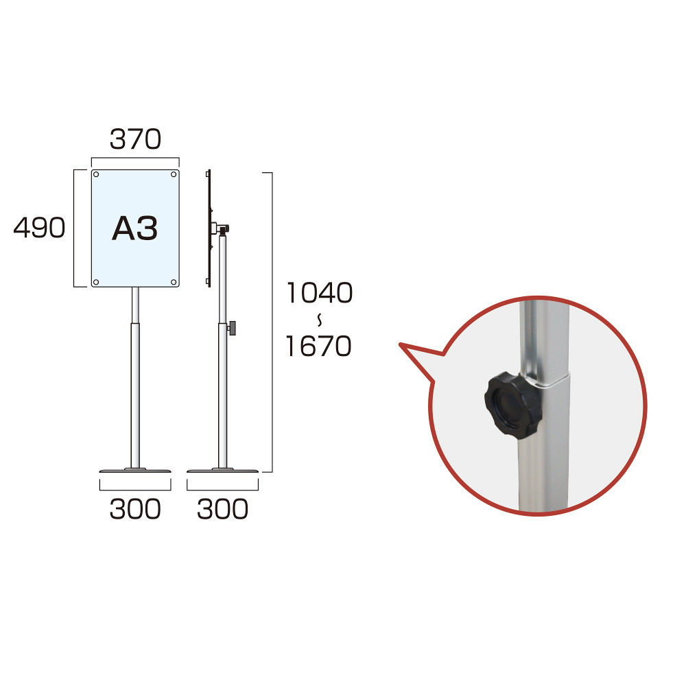 A2サイズのスタンドですが、下のまるい土台の直径が30センチと小さく、不安定で安全面が心配です。別途、重石を購入します。