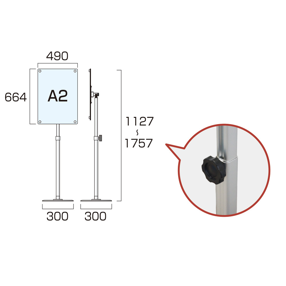 A2サイズのスタンドですが、下のまるい土台の直径が30センチと小さく、不安定で安全面が心配です。別途、重石を購入します。