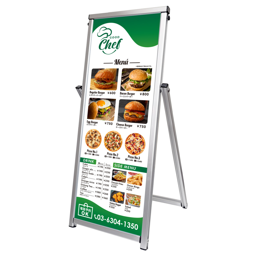 - 看板の両面にポスターを差し込むことができますので、OPEN・CLOSEやランチメニューやグランドメニューなど、場面で切り替えてご利用いただけます。