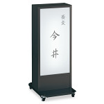 - ポスターの交換は、本体上部の左右にあるビスを取り外し、上辺のフレームを引き抜いて面板とアクリルカバーの間にポスターをセットするだけです。