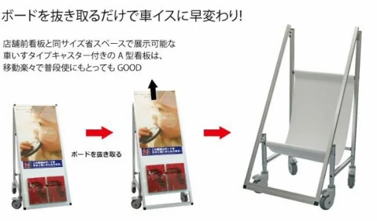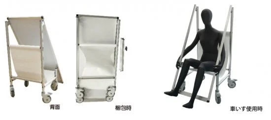 普段は注意看板として使用でき、怪我人が出た際は車いすとしても使用できる救護器具兼用の注意看板