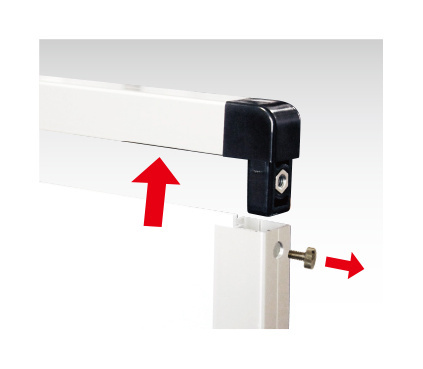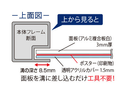 - 【ポスターの交換方法】ポスターの交換は、本体上部の左右にあるビスを取り外し、上辺のフレームを引き抜いて面板とアクリルカバーの間にポスターをセットするだけです。