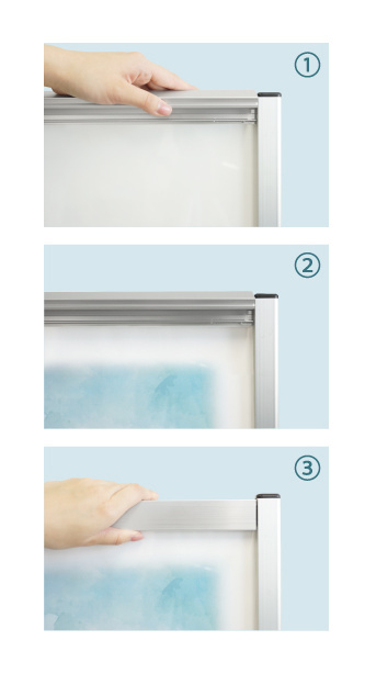 - 【ポスターの交換方法】上下2辺のフレームを開き、ポスターとアクリルカバーを片側に差し込むようにセットし、上下2辺のフレームを閉めアクリルカバーを固定します。