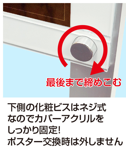 - 【ポスターの交換方法】ポスターの交換は、上部2個のマグネット化粧ビスを取り外し、面板とアクリルカバーの間にポスターが動かなくなるまで上から差し込み、化粧ビスを留めるだけです。詳しくは解説動画(https://youtu.be/DRTBEnjvJyA)をご覧ください。