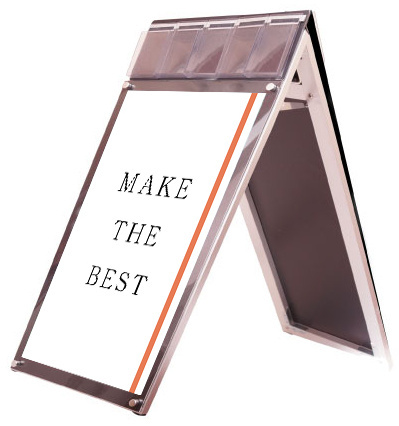 - お洒落な雰囲気にも合うA4三つ折りパンフレット用ケースが付いたスタンド看板
