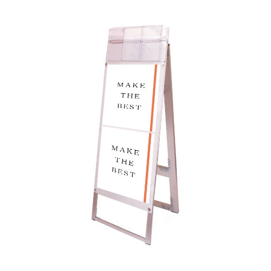 A4三つ折りパンフレットを配布できるケースが付いた四辺開閉式のスタンド看板