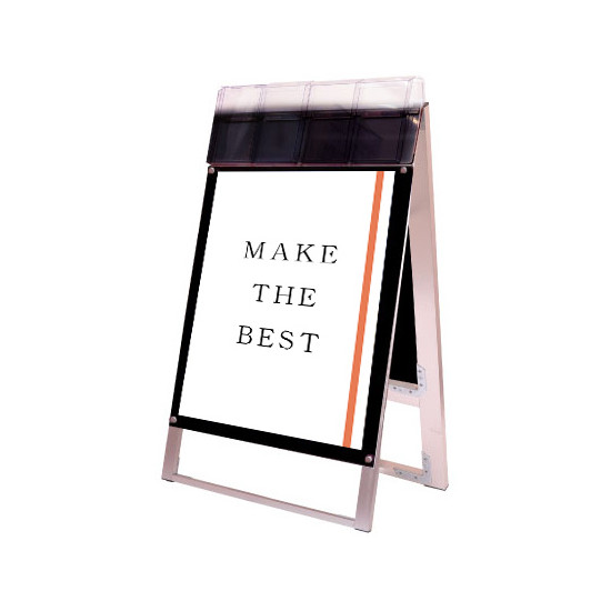 A4三つ折りパンフレットを配布できるケースが付いた四辺開閉式のスタンド看板