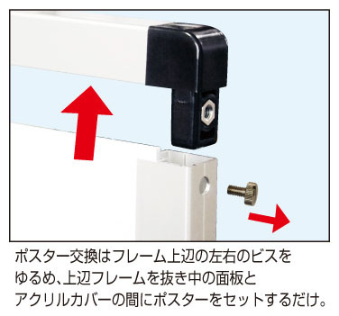 - 【ポスターの交換方法】ポスターの交換は、本体上部の左右にあるビスを取り外し、上辺のフレームを引き抜いて導光板とアクリルカバーの間にポスターをセットするだけです。