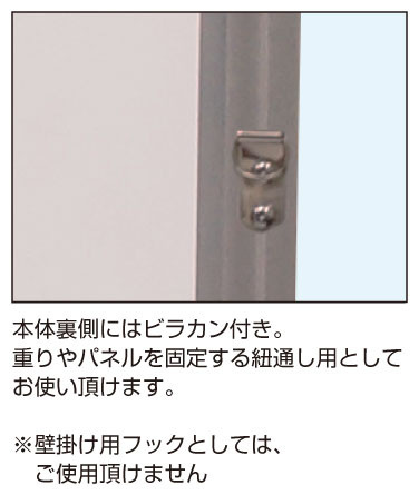 - 【置き型専用パネル】本体裏側には、設置時に重り等を固定するためのビラカンが付属しています。(壁掛け用フックとしてはご利用頂けません)パネル下部には少し脚部があり、地面とのクリアランスを設けています。