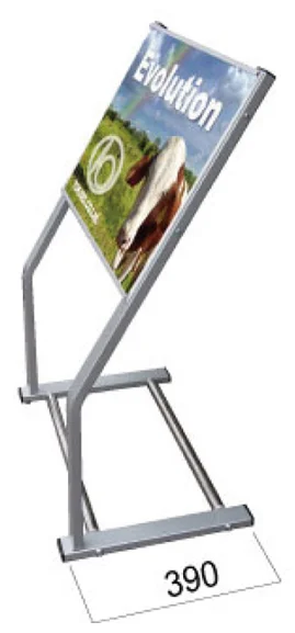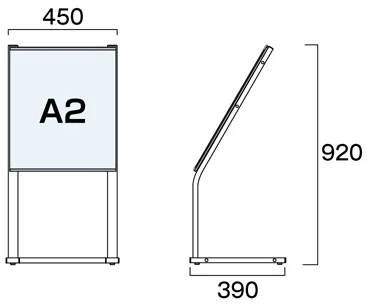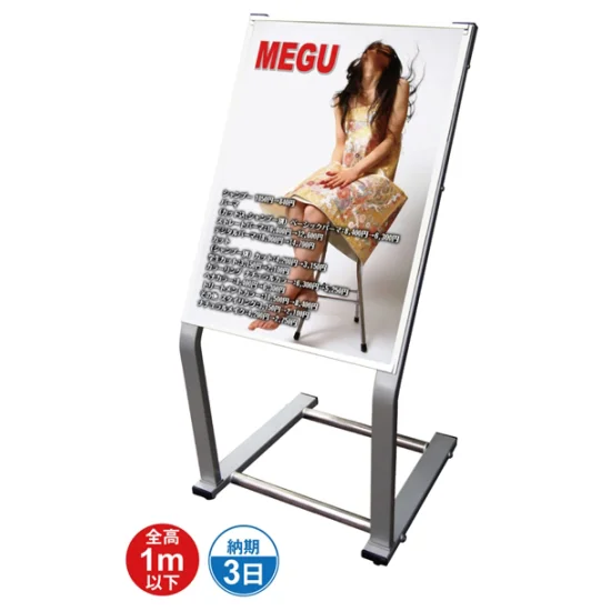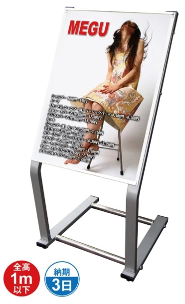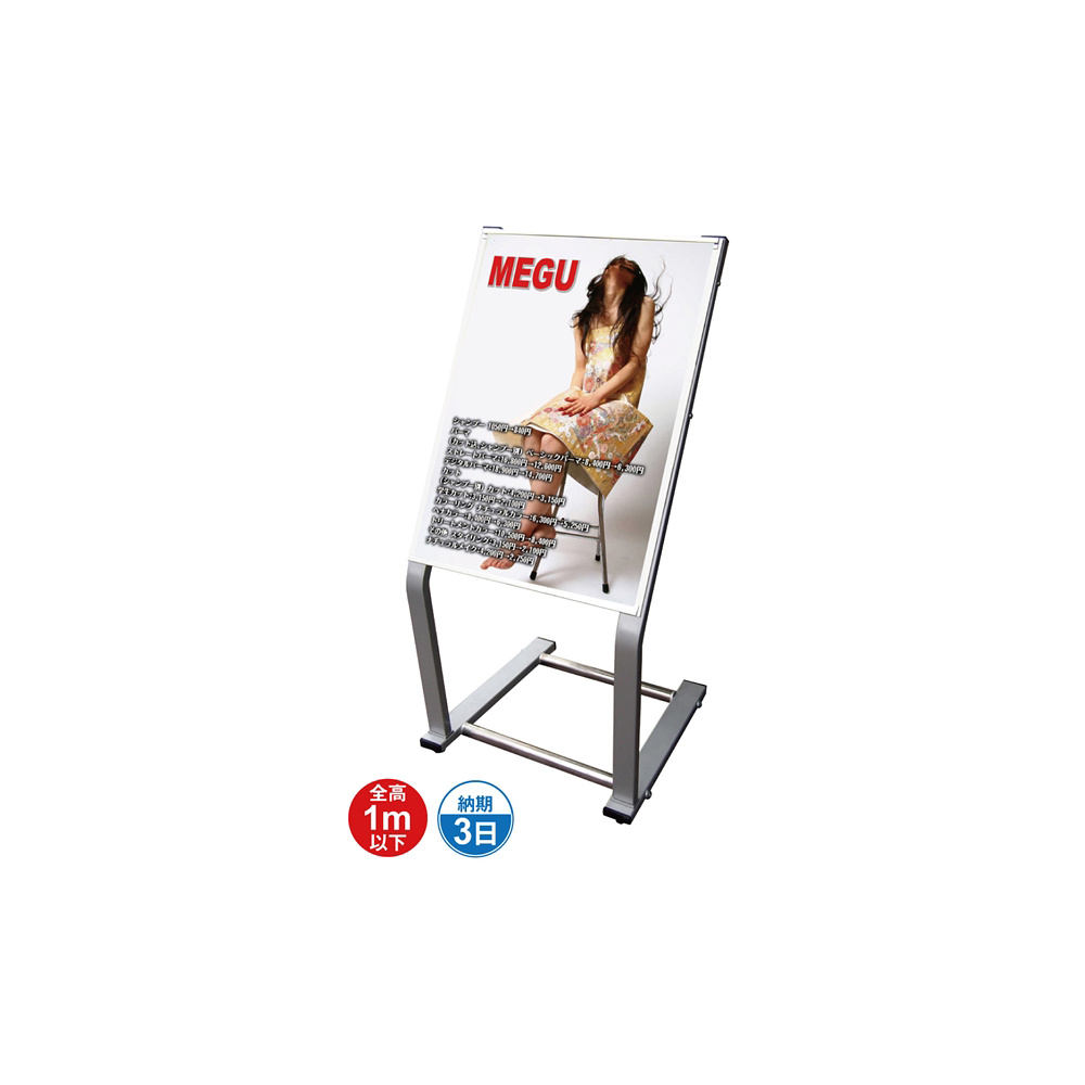 - 少し俯く状態で覗き込むような位置にポスターを展示できるC型フロアサインスタンドは、告知型看板としてA型や直立型とは一味違う展示スタイルをお楽しみいただけます。