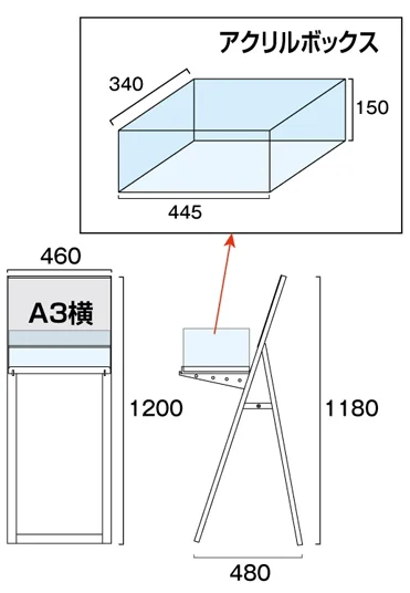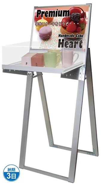 - A3サイズのサインと展示物が一緒に置ける1台2役の働き者スタンドです。