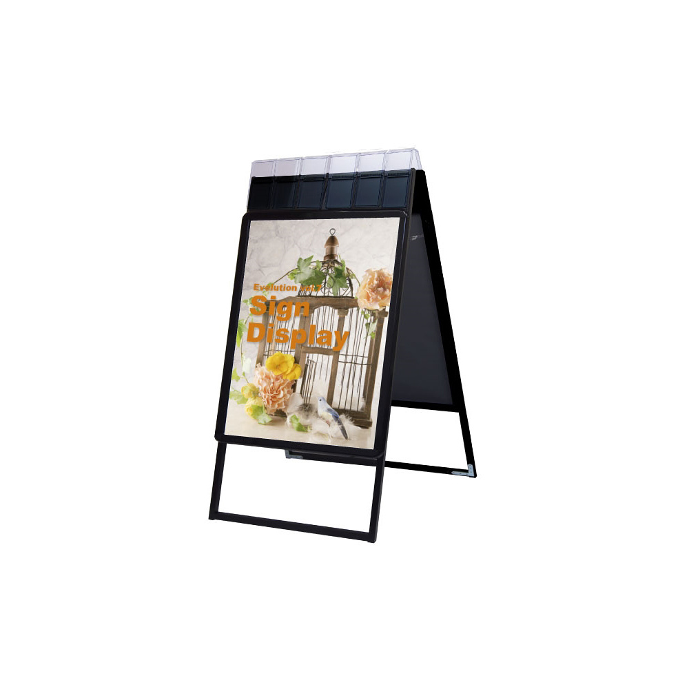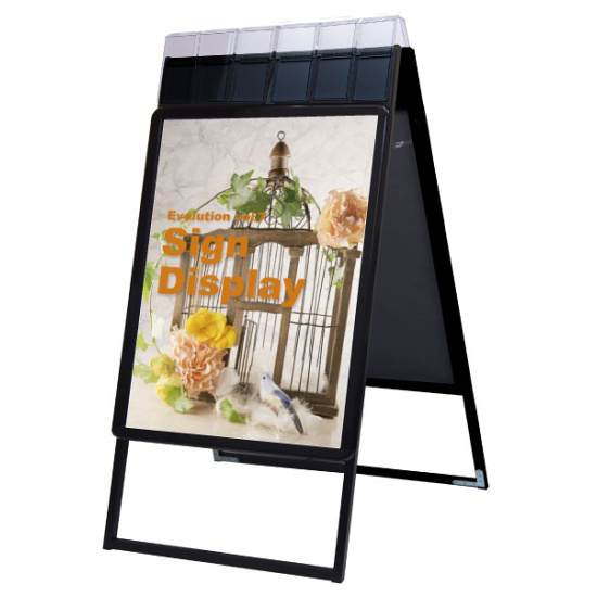 - 4辺がフロントオープン式のパネルの上に、蓋付のパンフレットケースが付いた画期的な看板!