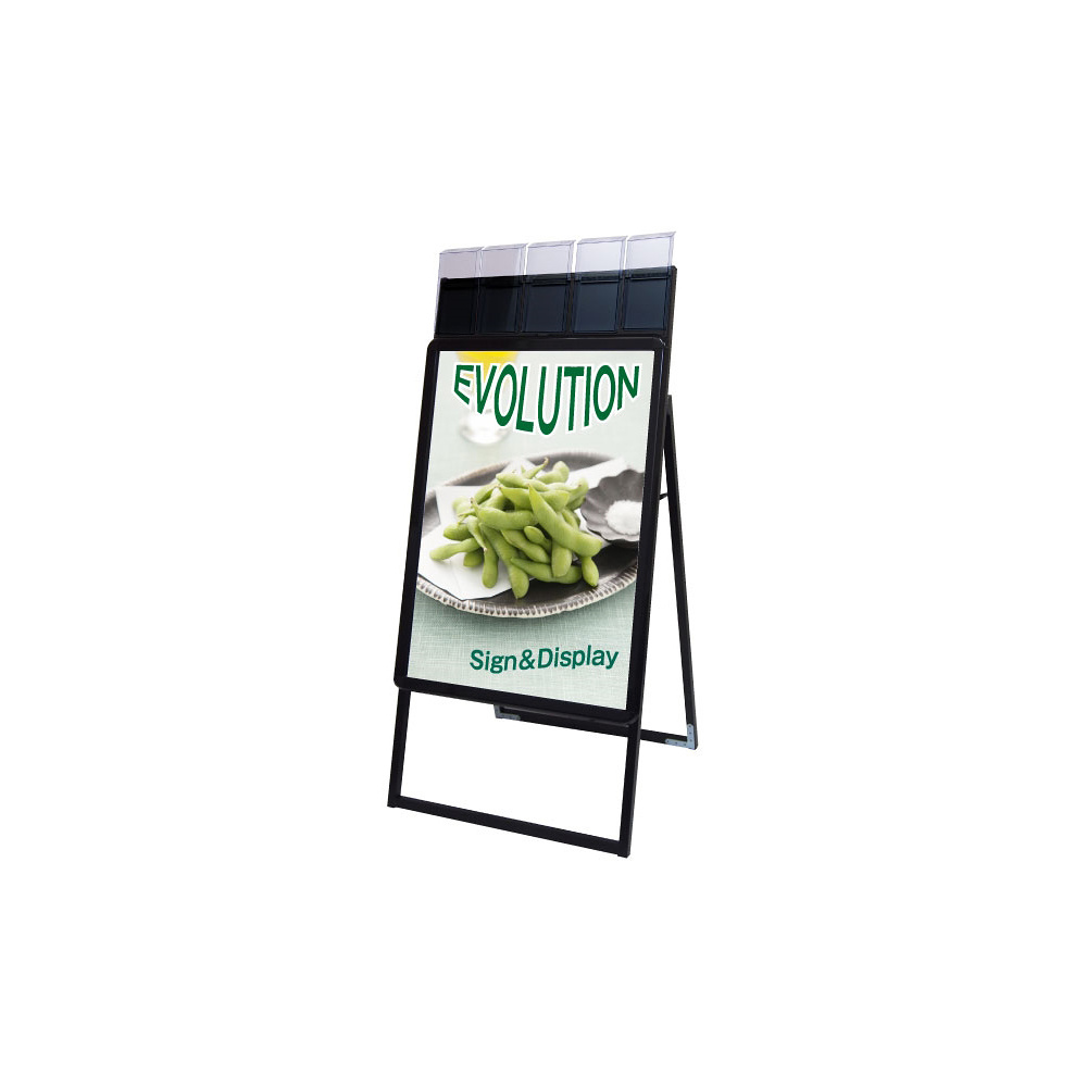 - 4辺がフロントオープン式のパネルの上に、蓋付のパンフレットケースが付いた画期的な看板!