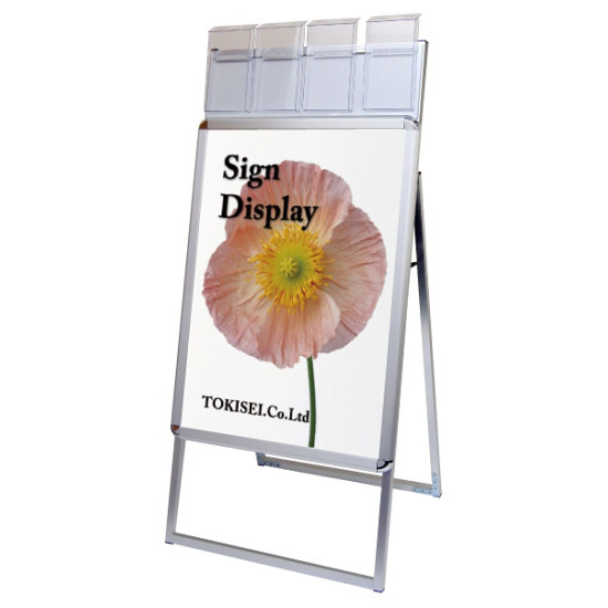- 4辺がフロントオープン式のパネルの上に、蓋付のパンフレットケースが付いた画期的な看板!