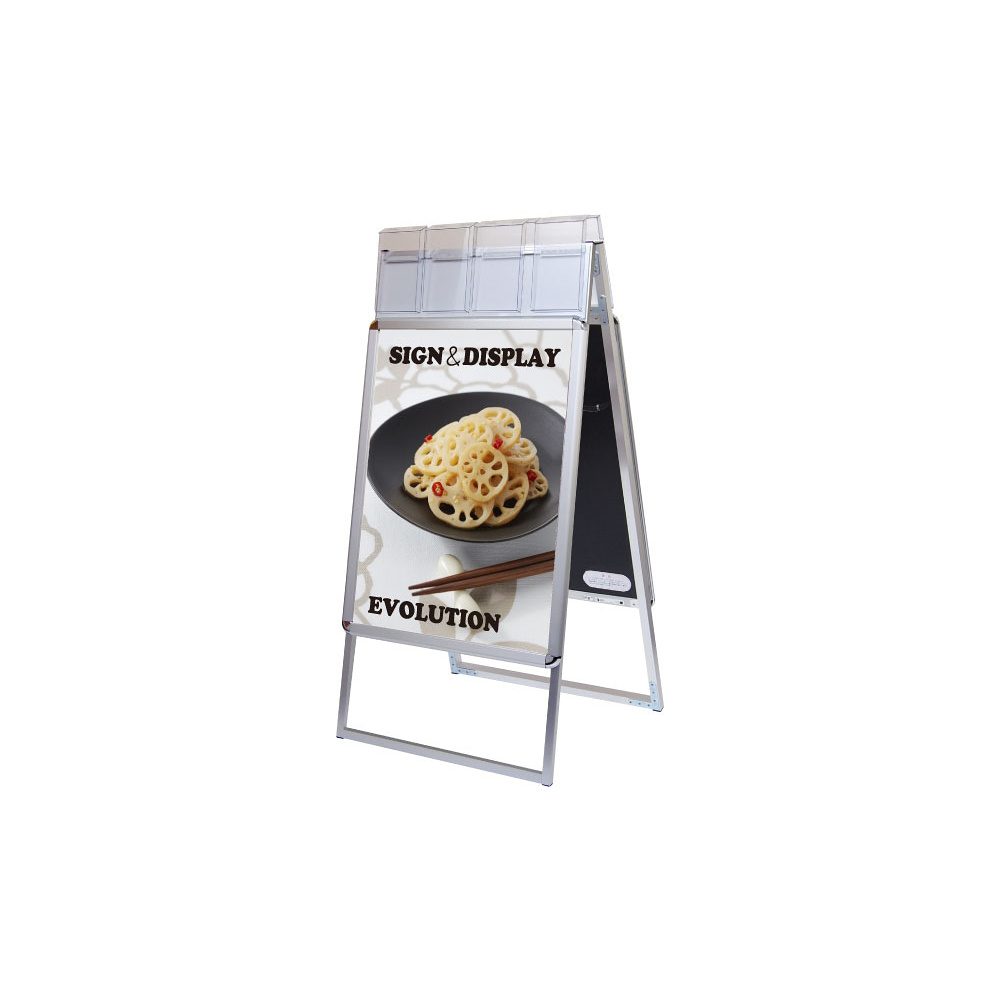 - 4辺がフロントオープン式のパネルの上に、蓋付のパンフレットケースが付いた画期的な看板!