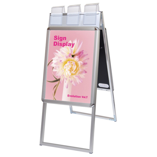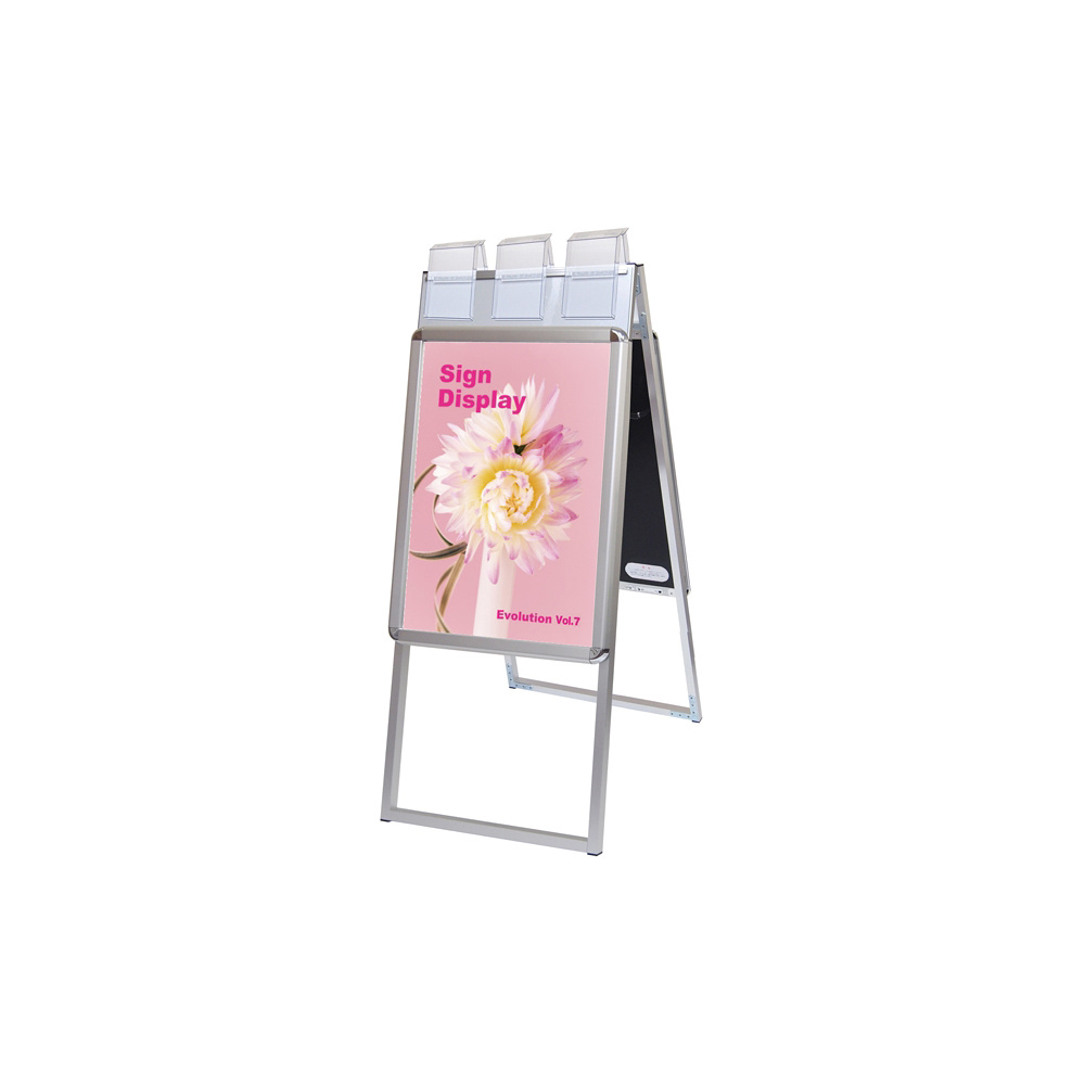 - 4辺がフロントオープン式のパネルの上に、蓋付のパンフレットケースが付いた画期的な看板!