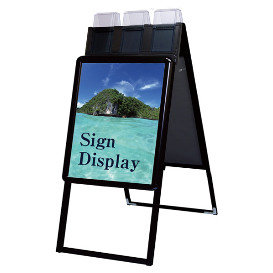 - 4辺がフロントオープン式のパネルの上に、蓋付のパンフレットケースが付いた画期的な看板!