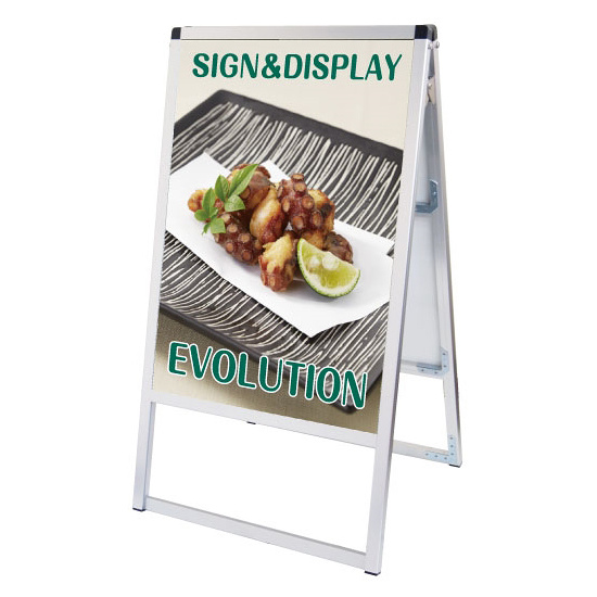 - 従来品のポスター用スタンド看板のように紙のポスターを背面板とアクリルカバーの間に挟んで展示する看板です。