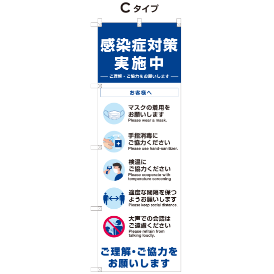 - イベントや展示会、店舗や施設の入口で来場者(来店者)に感染症予防を促すのぼり旗にポール・台がセットになったサインモールオリジナルアイテムです。
