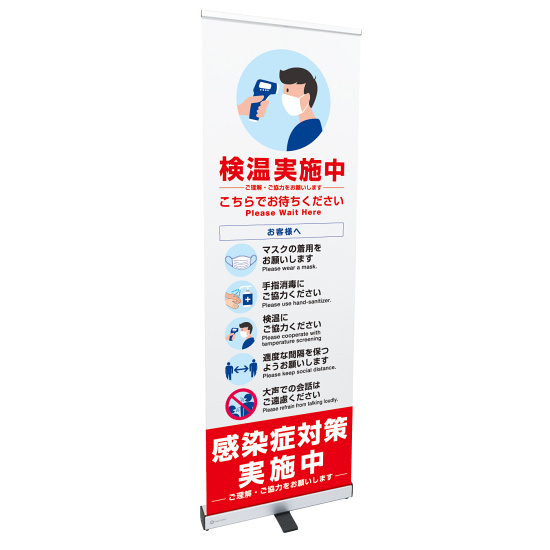 - イベントや展示会、店舗や施設の入口で来場者(来店者)に感染症予防を促すロールアップバナースタンド。