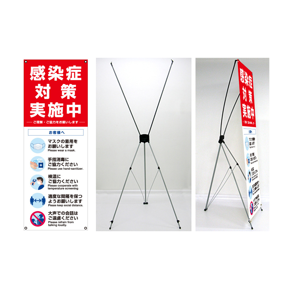 - バナーXスタンドブラック(小)に感染症予防内容を印刷したトロピカル製印刷幕を付属したサインモールオリジナルアイテムです。