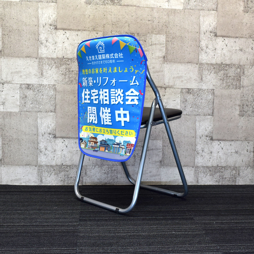 - イベントや展示会などのブース作りの一環に。無機質なパイプ椅子をあっという間に広告面として有効活用できます。
