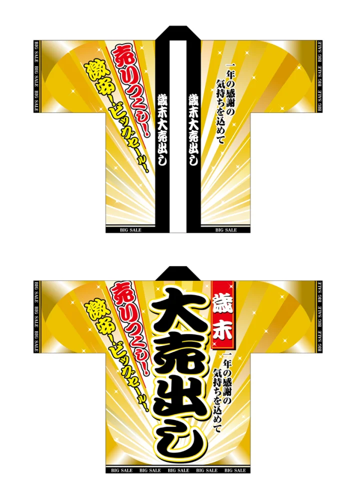 「フルカラーハッピ 5106 歳末大売出し (受注生産)」の導入をご検討中ですか? 大量注文・複数台のご検討に応じたお見積りのご相談、最短納期や送料、仕様・サイズの確認など、 半被(はっぴ)選びをまとめてサポートいたします。