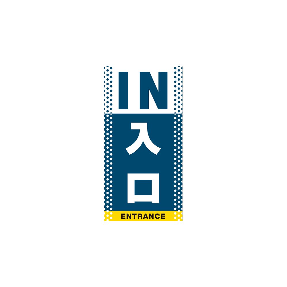 - 英語表記の「IN」と大きな「入口」の文字がお客様をお出迎えします。目立つドット柄デザイン。