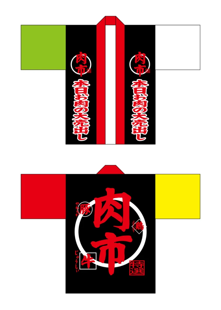 「フルカラーハッピ 68725 肉市 (受注生産)」の導入をご検討中ですか? 大量注文・複数台のご検討に応じたお見積りのご相談、最短納期や送料、仕様・サイズの確認など、 半被(はっぴ)選びをまとめてサポートいたします。