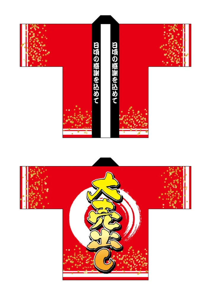 「フルカラーハッピ 69848 大売り出し (受注生産)」の導入をご検討中ですか? 大量注文・複数台のご検討に応じたお見積りのご相談、最短納期や送料、仕様・サイズの確認など、 半被(はっぴ)選びをまとめてサポートいたします。