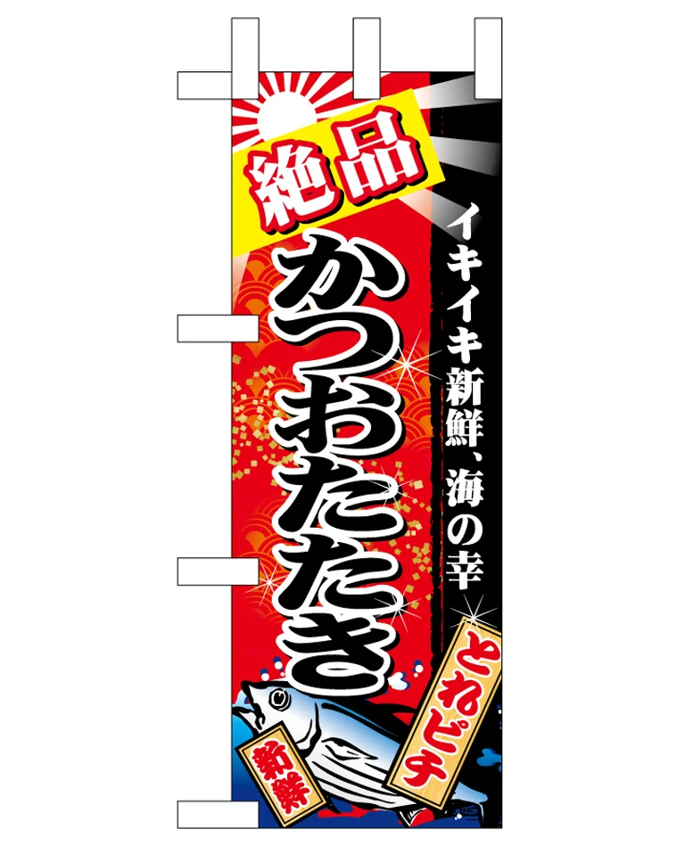 「ミニのぼり旗 絶品かつおたたき 赤地 W100×H280mm (45154)」の導入をご検討中ですか? 大量注文・複数台のご検討に応じたお見積りのご相談、最短納期や送料、仕様・サイズの確認など、 鮮魚 ミニのぼり選びをまとめてサポートいたします。