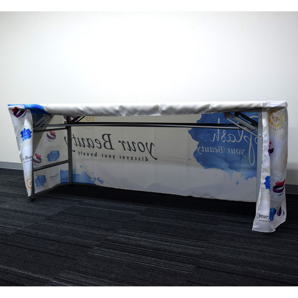 - ■前掛けタイプ:側面のない前掛けタイプは、正面と天板のみをカバーするテーブルクロスになります。最もコストパフォーマンスに優れたテーブルクロスで、テーブルサイズは毎回変わる場合や側面のカバーが不要な場合にオススメの一番簡易的なテーブルクロスです。