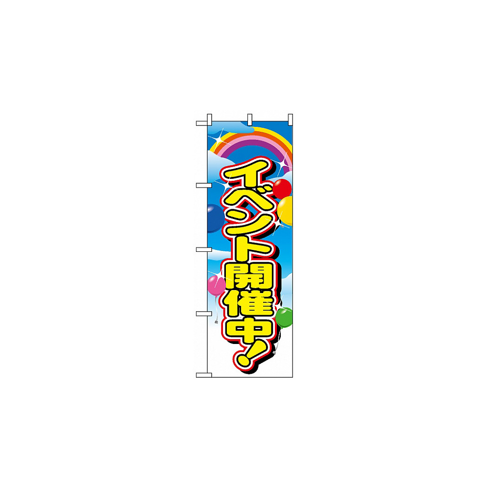 イベント開催中を告知する定番のぼり旗です。 風船や虹のイラストが楽しいイベントの雰囲気を演出します。 イベント会場や店舗の店頭を賑やかに彩ります。