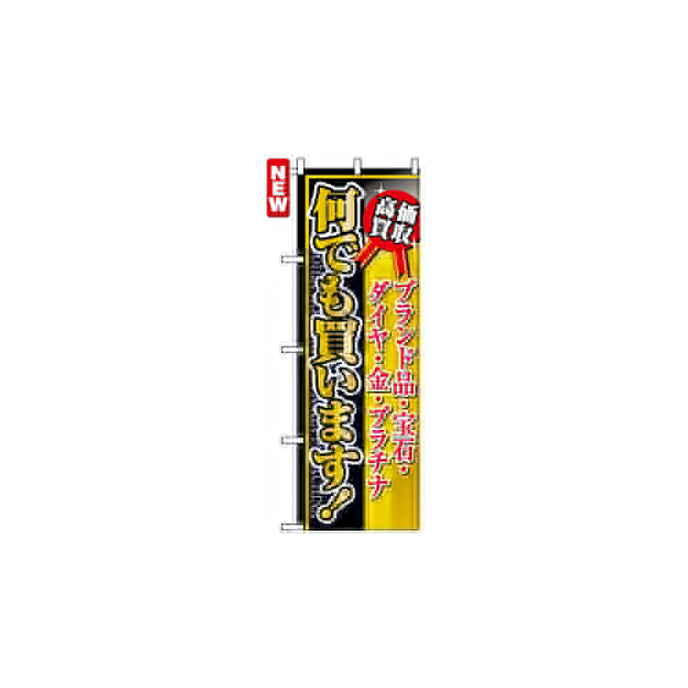 買取をアピールするのぼり旗です。 文言は「なんでも買います!ブランド品・宝石・ダイヤ・プラチナ・高価買取」。 デザインも黒ベースにゴールドとレッドで高級感のあるデザインに仕上がっています。