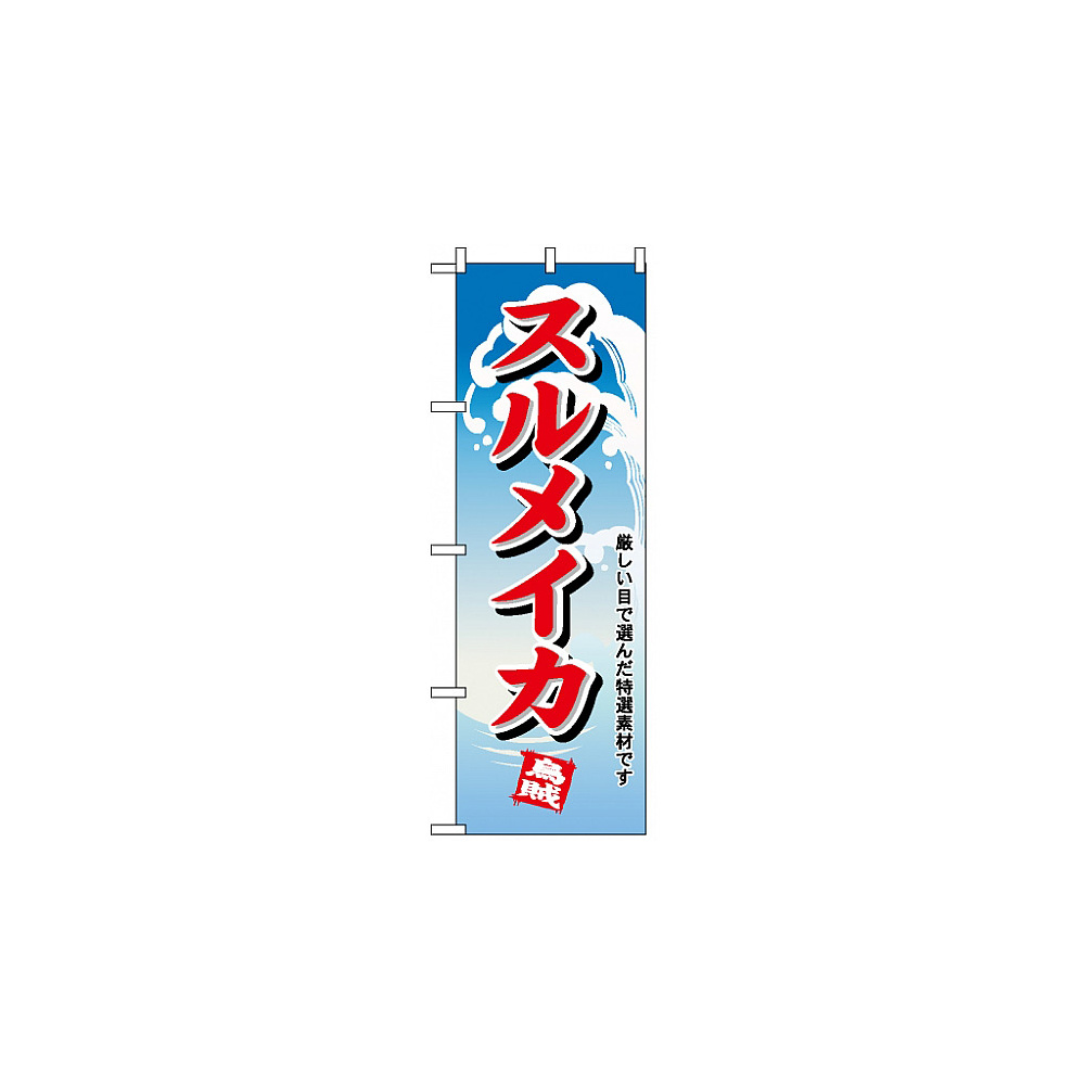 スルメイカを宣伝する寿司ネタのぼり旗です。右側に「厳しい目で選んだ厳選素材です」とさり気なくこだわりをアピール。お寿司屋や魚屋さんにオススメの鮮魚のぼり旗です。